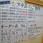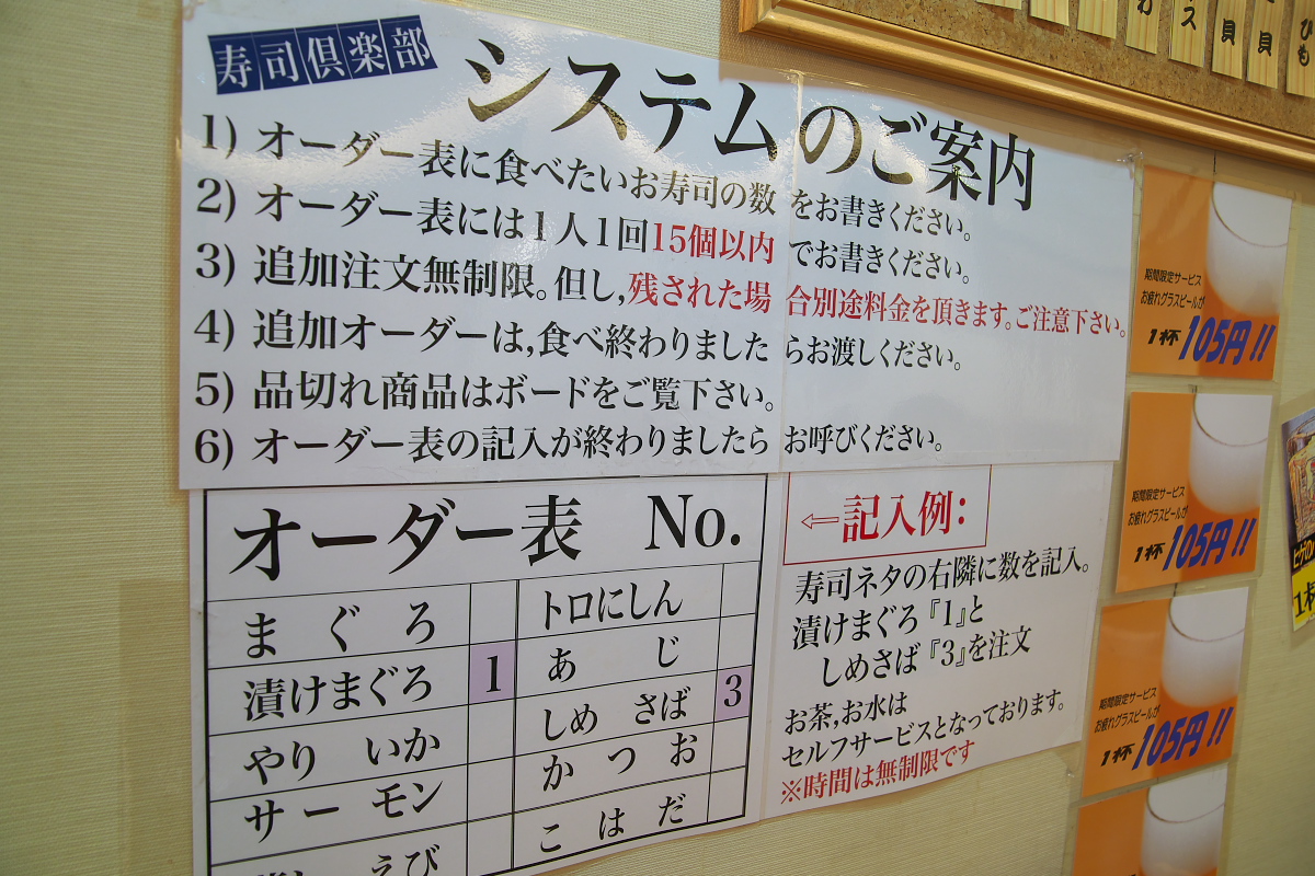 システムは簡単。食べ放題コースを注文した後、テーブルに置かれたネタの名前があいてある用紙に自分が食べたい数を記入するだけ。ただし、1回の注文で頼めるのは一人当たり15個までなので注意。
