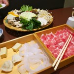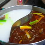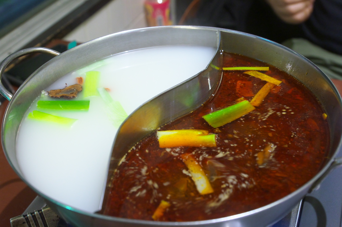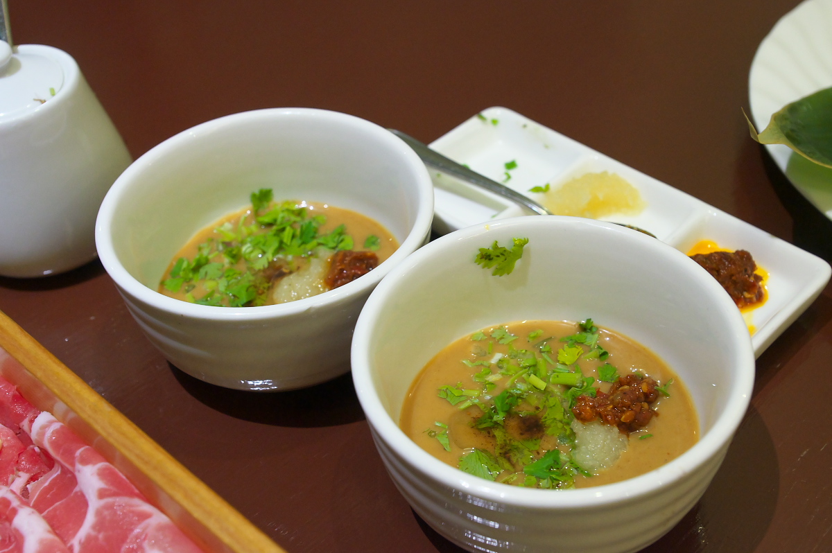 火鍋は白湯スープと紅湯スープの2種のスープ。練りゴマと薬味をスープで割ってつけだれを作るのですが、これはなかなかの美味です。